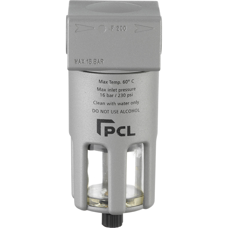 PCL’s Filters are designed to clean and dry compressed air efficiently filters to 10 microns. Featuring polycarbonate bowls, allowing the user to easily monitor the element’s condition and the collected liquid’s level. The bowl is surrounded with protective metal as a safety measure to protect the user in case of excessive pressures, temperatures, or aggressive chemicals.